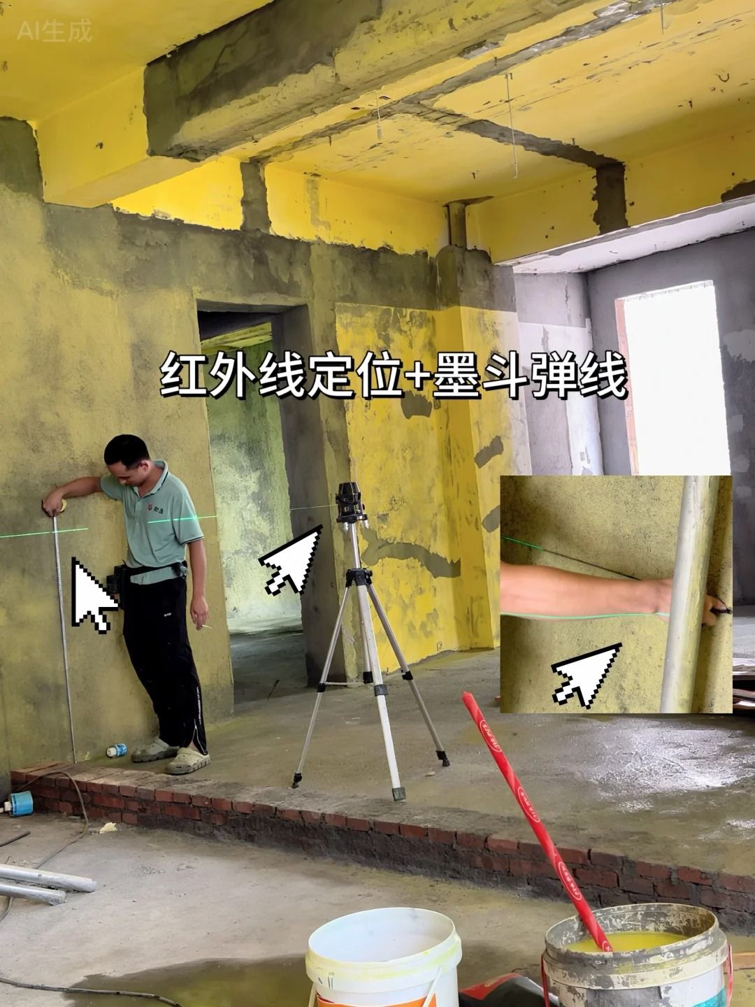 1、红外线+墨斗弹线精准定位(使用红外线找到一米水平线)