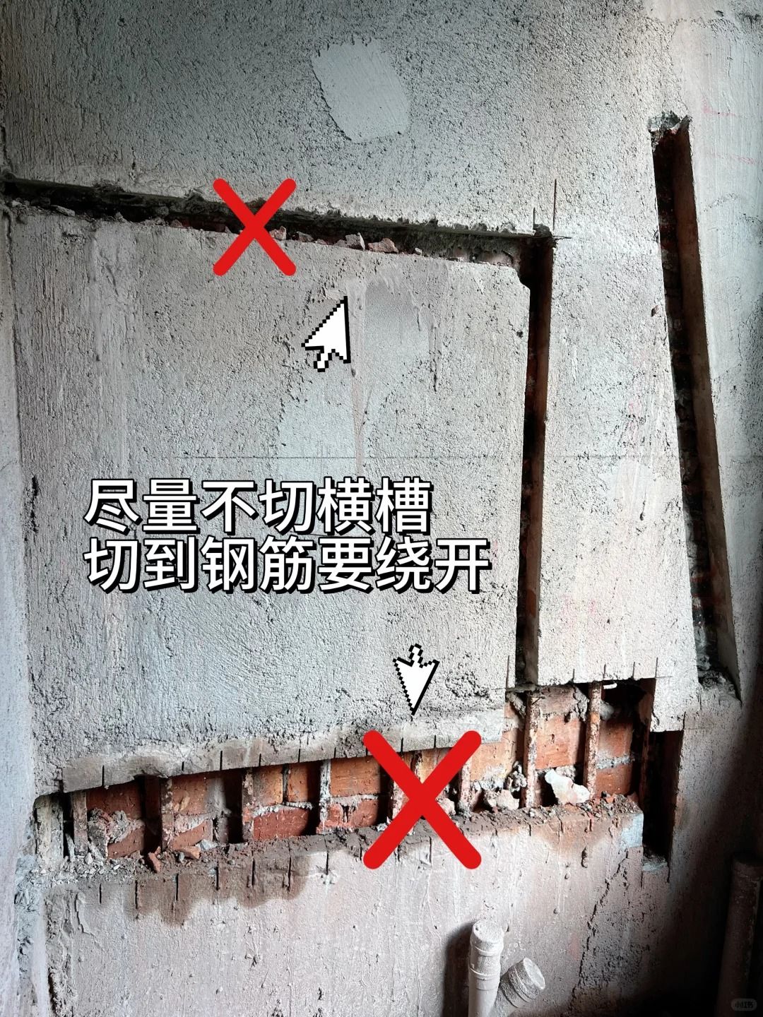 5、尽量不要开横槽,遇到钢筋要绕开(切断钢筋=破坏承重结构)