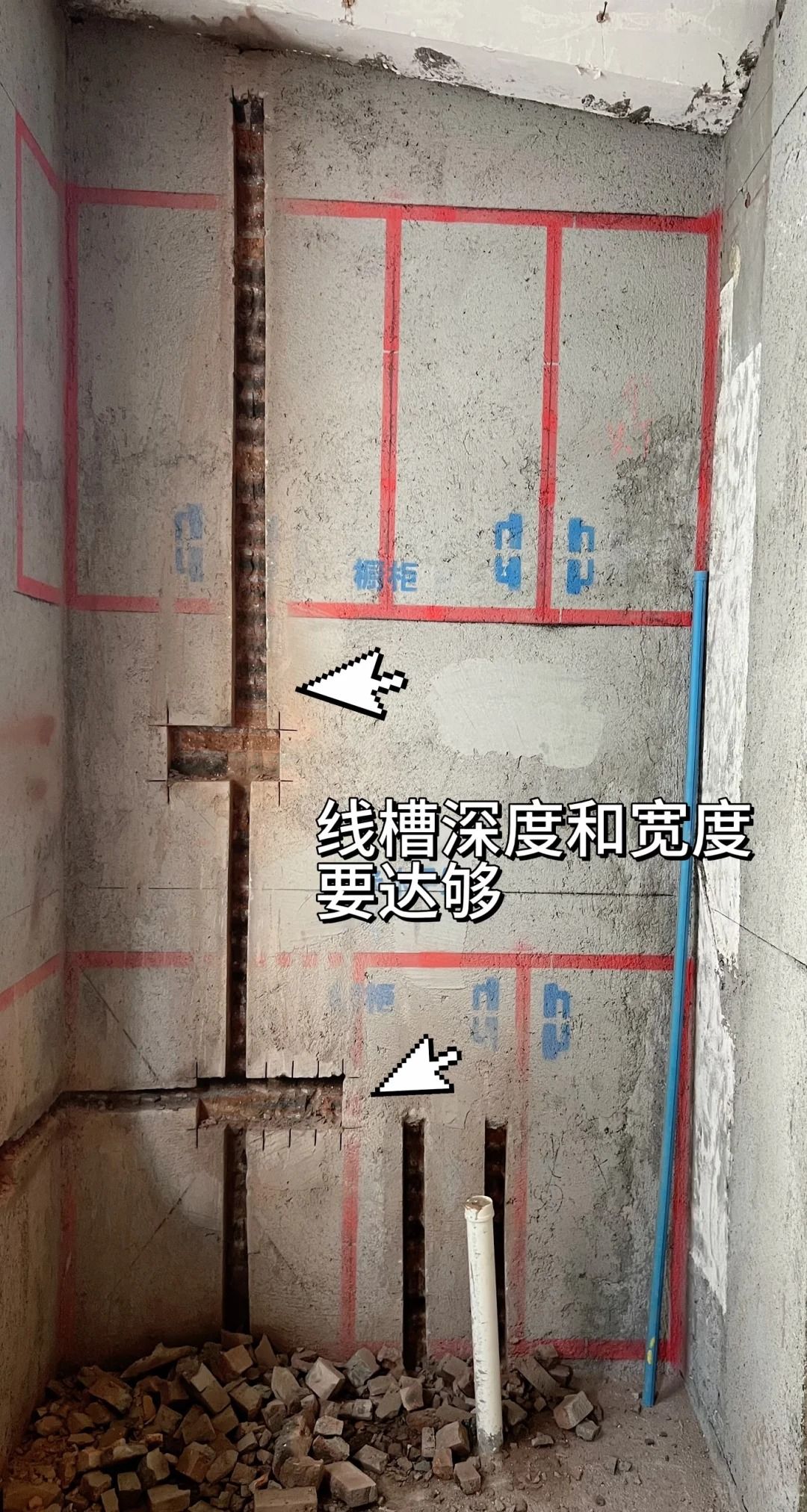 6、线槽宽度和深度要达够(开槽宽度确保不小于管道直径的1.5倍,开槽深度为3~4cm)